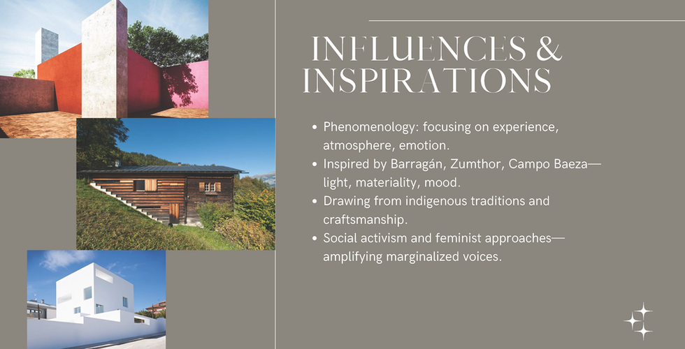 On this project, my personal research contributions included critical reflections on Gabriela Carrillo’s influences and how they appear in her work. Her designs are shaped by phenomenology and community-based practice, drawing from architects like Luis Barragán and Peter Zumthor to create spaces that engage the senses through light, texture, and sound. These influences combine with her feminist and participatory values, resulting in architecture that is both empathetic and inclusive. Projects like the Library for the Blind and Visually Impaired clearly reflect this, as Carrillo translates sensory awareness and social engagement into built form. This makes accessibility, perception, and cultural sensitivity central to her design language.